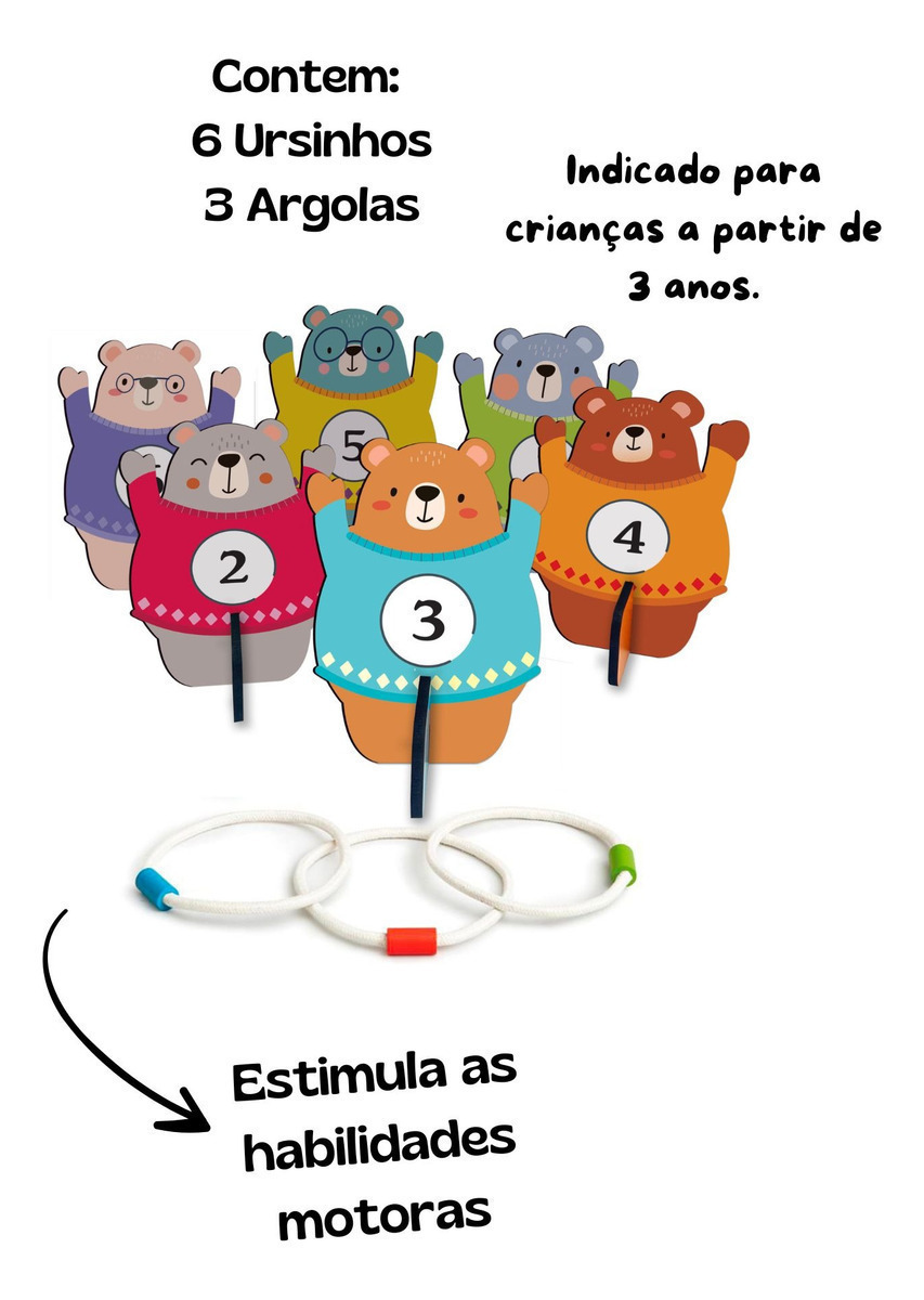 Entre no mundo da diversão com nosso Jogo de Argolas Ursinhos! Desenvolva suas habilidades motoras e concentração enquanto acerta todas as argolas ao redor dos ursinhos.
