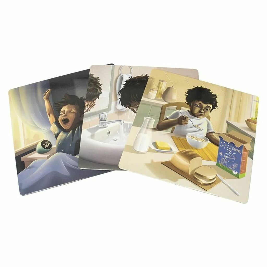Cada ação é apresentada com uma ilustração adequada ás necessidades visuais de crianças com TEA, combinada com pictogramas que permitem a leitura por meio da comunicação Aumentativa e Alternativa (CAA).