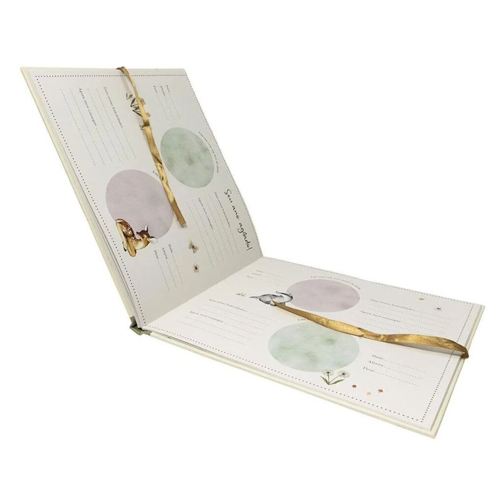 Com espaços para anotar datas e conquistas importantes, adicionar fotografias e impressões das mãos e dos pés do seu bebê, e dois bolsos para guardar lembranças preciosas e cartas para o seu filho no futuro, este será um objeto de recordação que sua família poderá estimar para sempre.